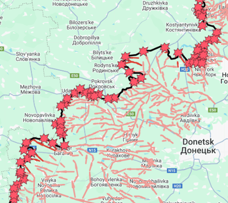 Static shot from the Russo-Ukrainian War interactive map. The Kostyantynivka-Pokrovsk-Novopavlivka frontline by the evening, 4 July 2025. All information on the maps is approximate.
