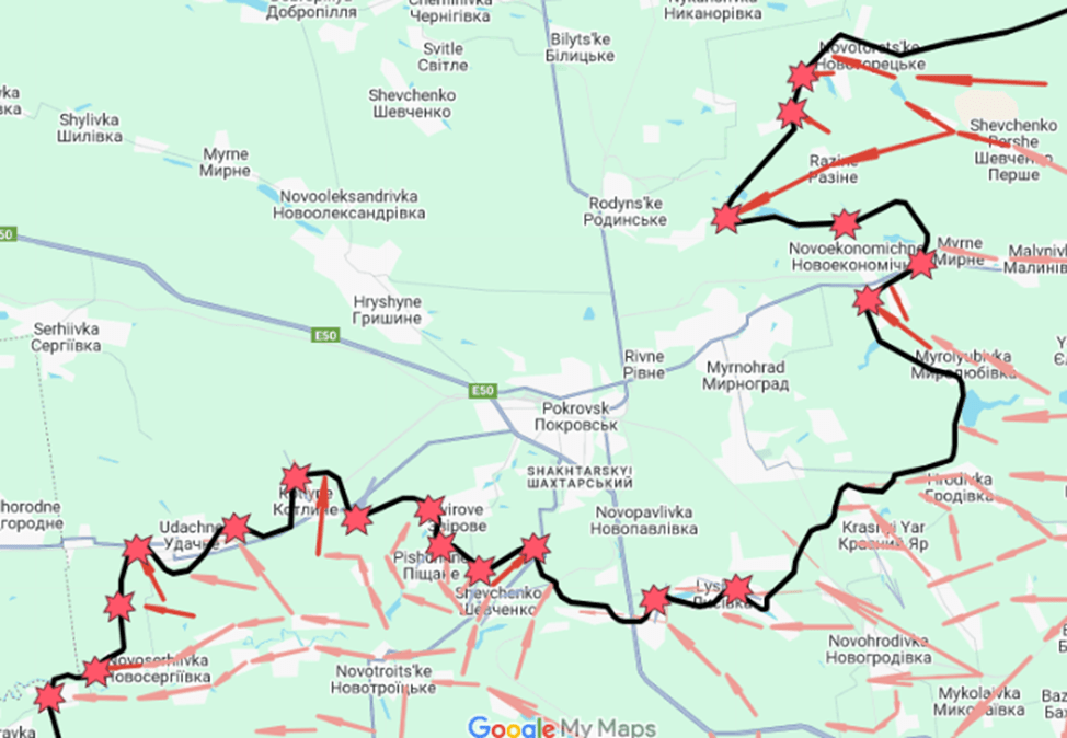 Southwest of Pokrovsk, Russians completed the recapture of Pishchane, pushed a little forward in the area of Kotlyne, and advanced a little in the space west of Udachne.