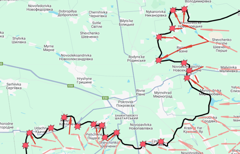 A static shot from the Russo-Ukrainian War interactive map. The Pokrovsk frontline by the noon, 25 July 2025. All information on the maps is approximate.