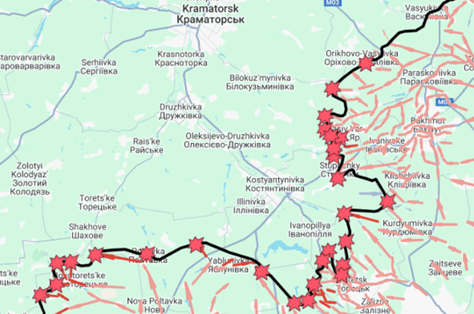 A static shot from the Russo-Ukrainian War interactive map. The Kostyantynivka frontline by the afternoon, 1 August 2025. All information on the maps is approximate.